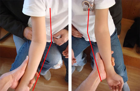 目安として赤い線を入れてありますが、赤線の角度が左肘と比較すると右肘は角度が強くなっています。