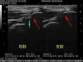 肘関節100度屈曲位での、後方からの長軸走査(↑)。右肘では、赤矢印の先が繋がっておりません。 水色矢印の先にある白い線は、本来であれば左肘関節の様に赤矢印右側の白い線まで一連に繋がっているべきですが、右肘関節は連続していません。