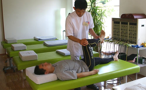 スポーツ選手にとってケガは、それまでに期間を掛けて取り組んできたこと一瞬にしてふいにしてしまう悲しいショッキングな出来事です。それゆえにケガから目を背けるように、痛みを我慢し無理に練習や競技を続けたり、リハビリテーションもそこそこに練習復帰をし、さらに悪化・長期化させ、最悪は選手継続を断念せざるをえない状態にまでになる例が今も少なくありません。当院では軽度の捻挫から、手術後のリハビリテーションまで、機能回復だけでなく、その競技の特異性に合った運動療法メニューの実施で、本格的な(技術的な)トレーニングに移行できる身体にいち早く、確実、安全に戻していけるようにサポートしております。 (前十字靭帯再建手術後の選手への施術例)